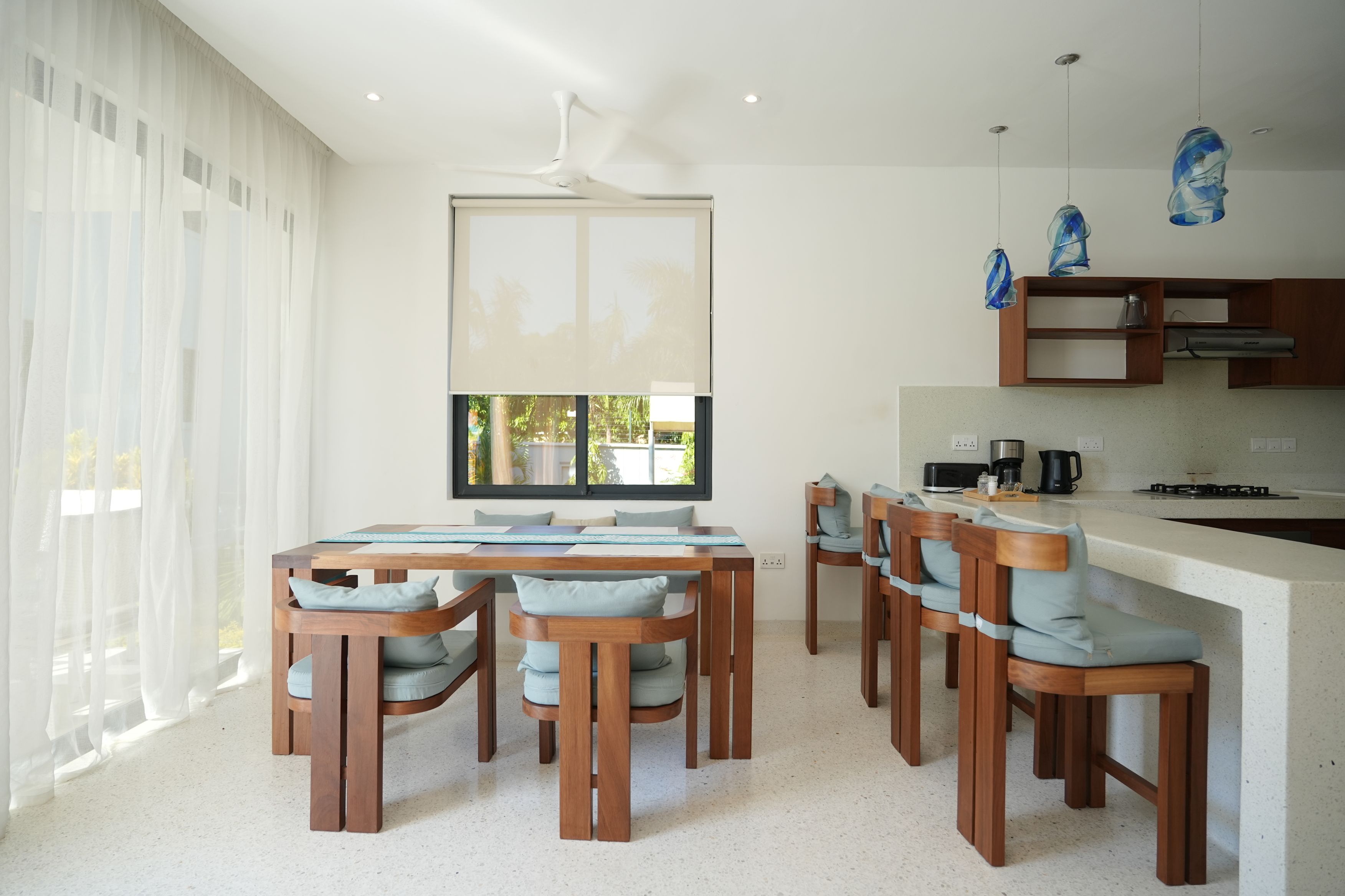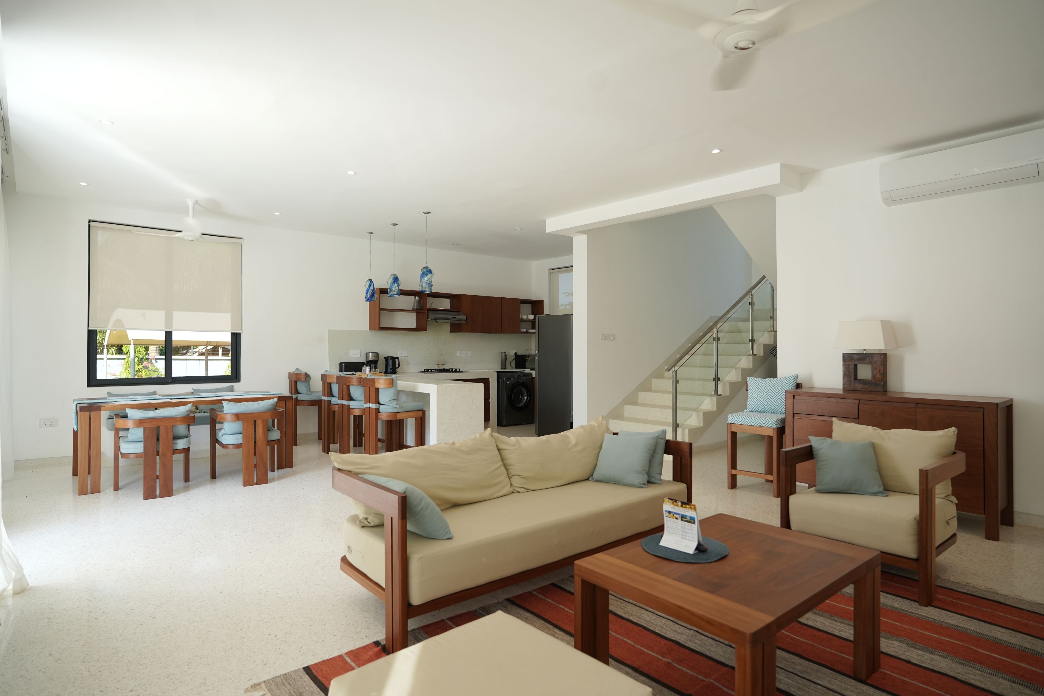 The open-plan living and dining area is bright and inviting, providing a comfortable space to unwind after a day of work or leisure. A fully equipped kitchen allows guests the convenience of preparing meals during their stay (Festive Rates 59000)