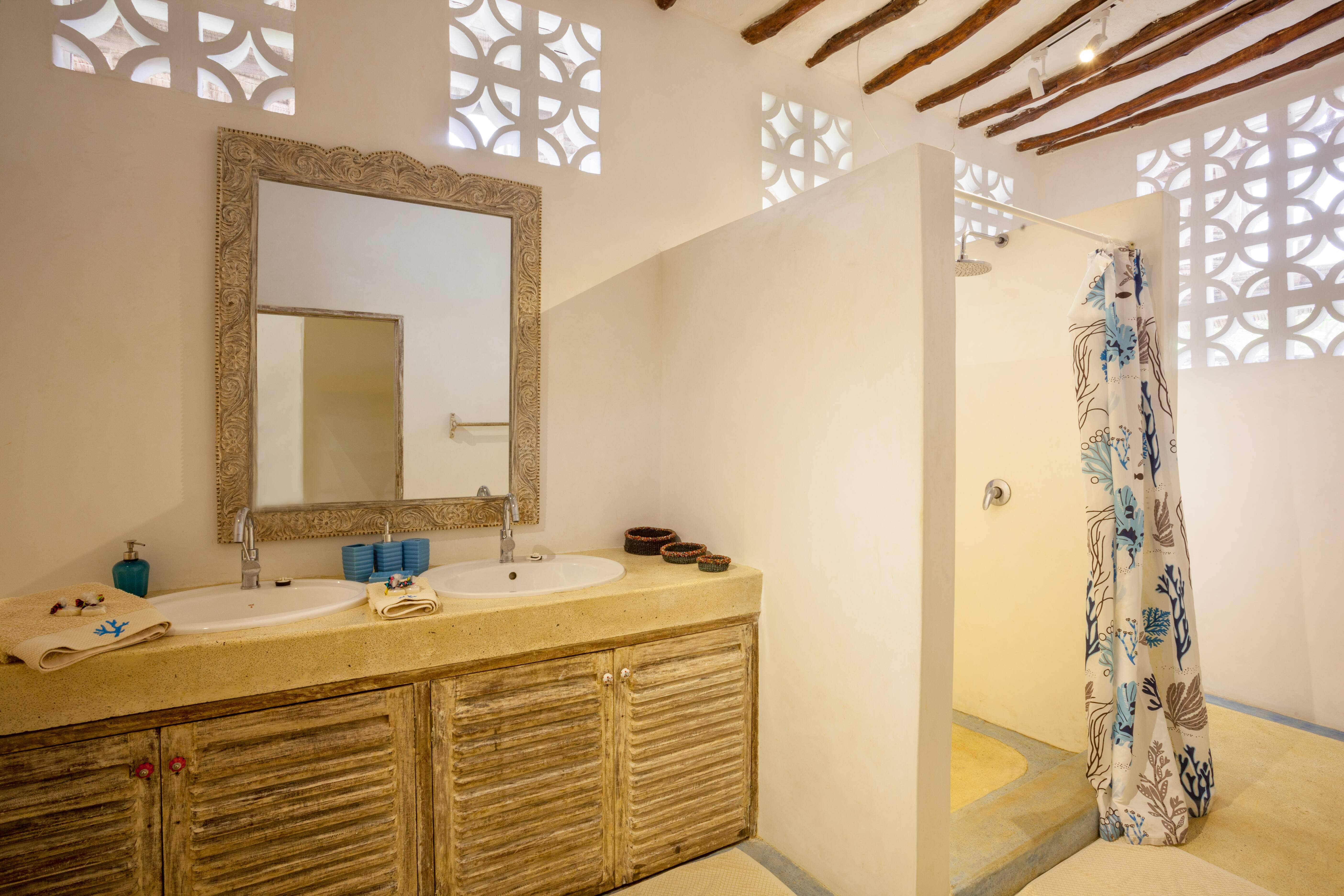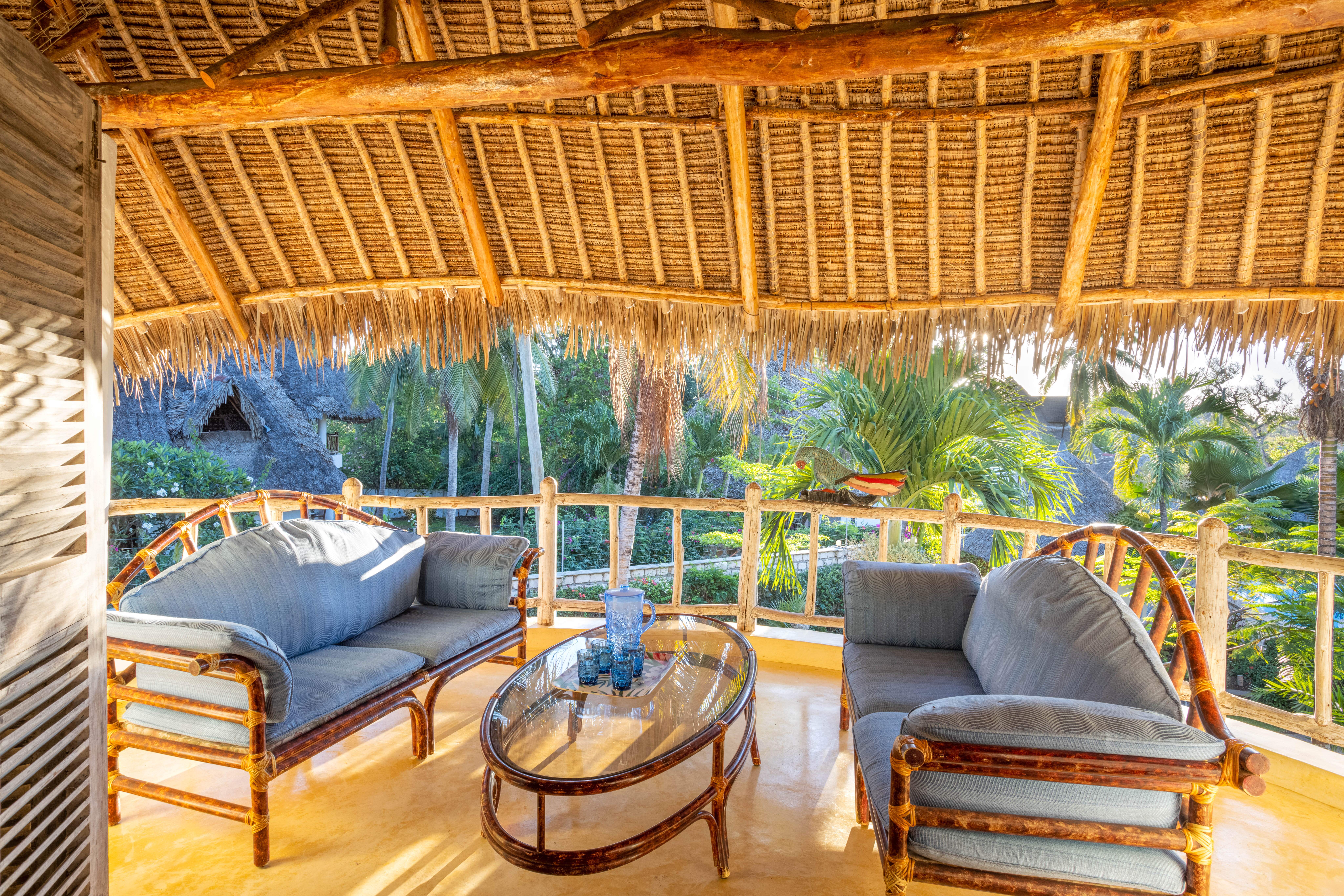 The ground floor has a spacious kitchen, opening on the rear, on a second smaller terrace with tables and chairs. The 2 double bedrooms on the ground floor are equipped with mosquito nets and an extra single bed in each. On the same floor, there are two bathrooms with shower.